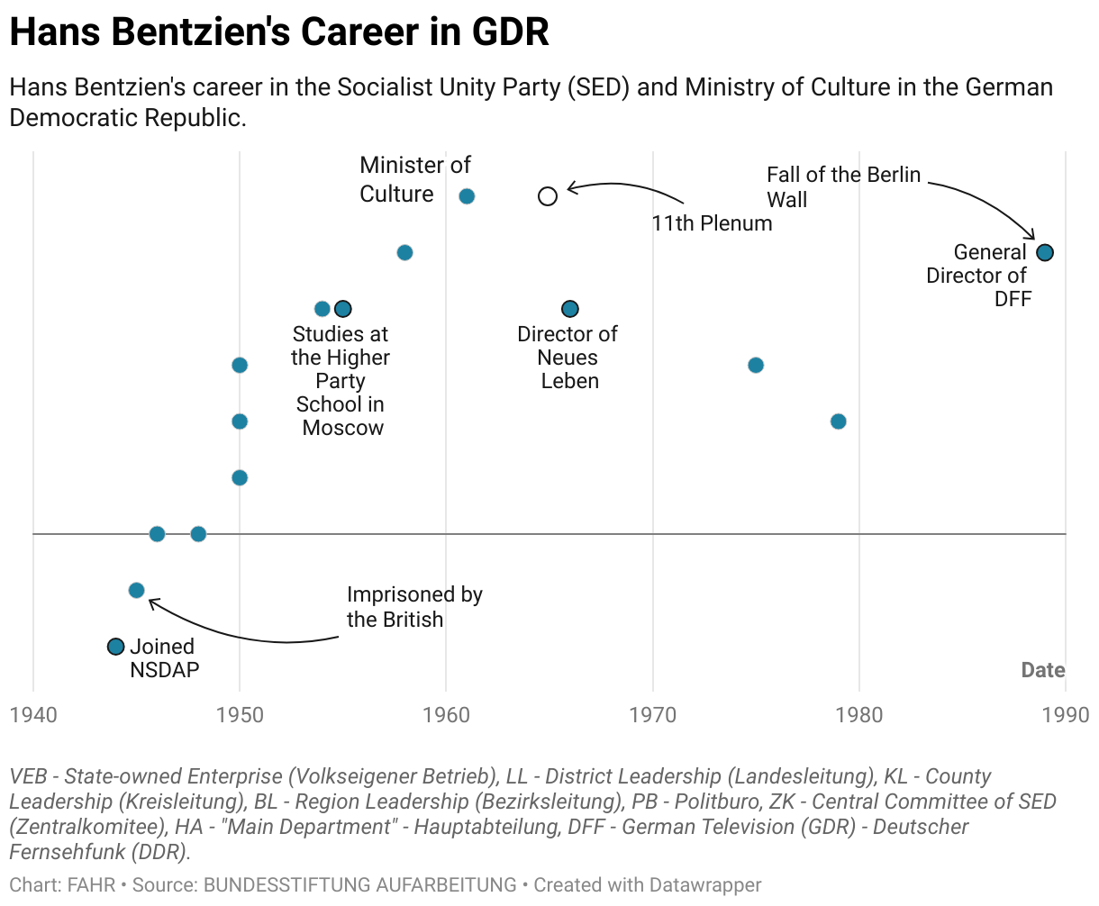 Here, it is shown how Bentzien’s career has developed over the course of GDR. You can see how the so-called “11th Plenum” serves a role of a turning point of his career. The full chart with all of his positions.