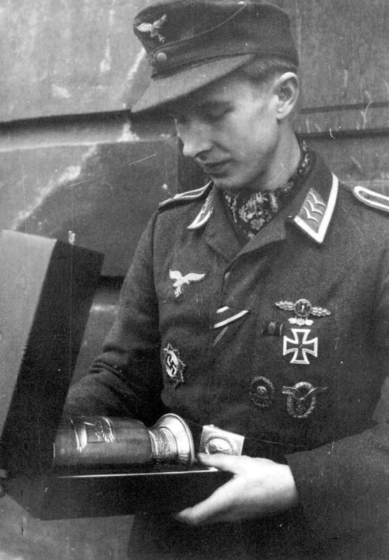 A German pilot with the rank of Feldwebel (staff sergeant) holding a “Honor Goblet of the Luftwaffe”. The Luftwaffe “Honor Goblet” ranked between the Iron Cross of the First Class and the Knight’s Cross/German Golden Cross. It was awarded only to combat pilots for exceptional achievements in combat.