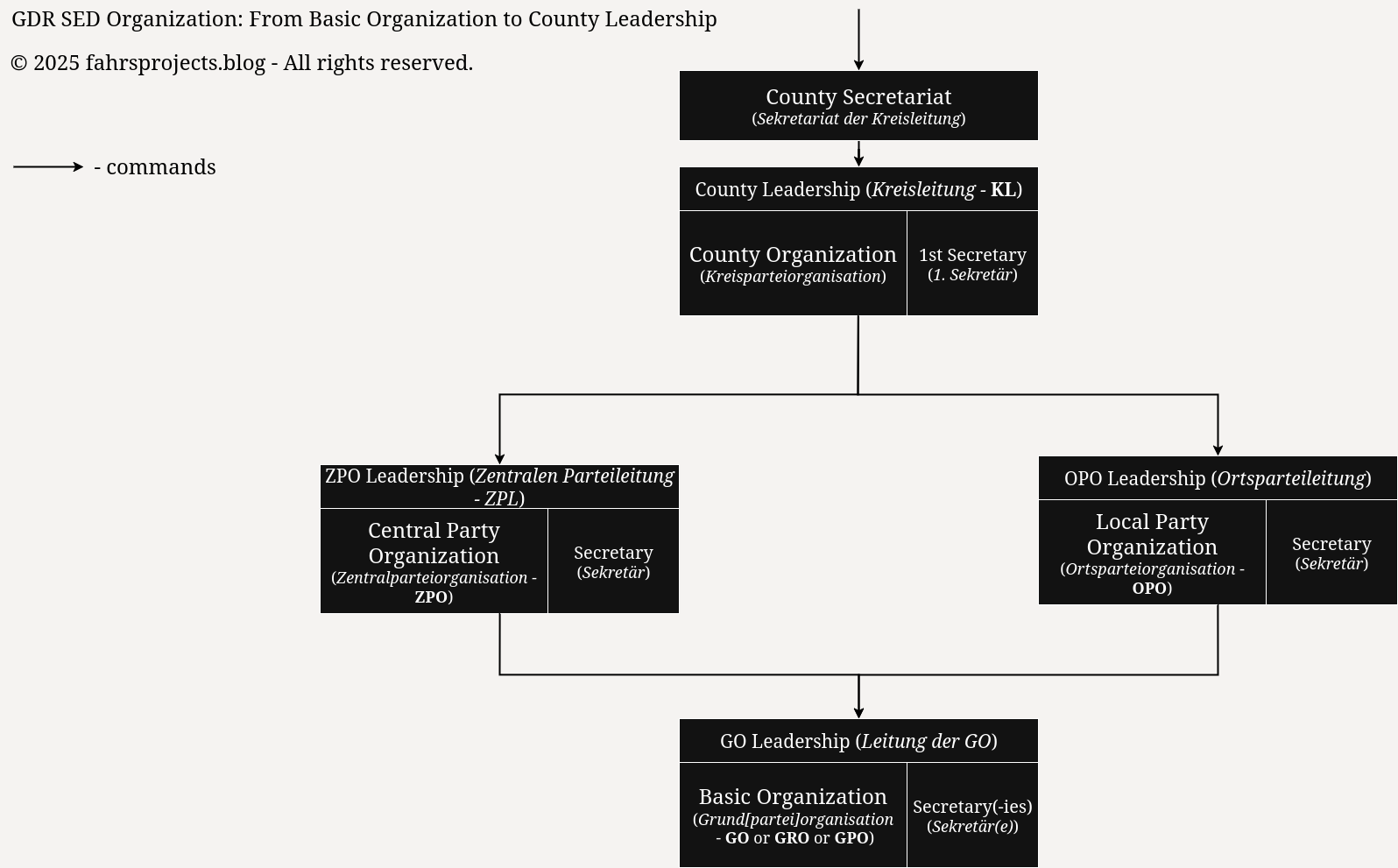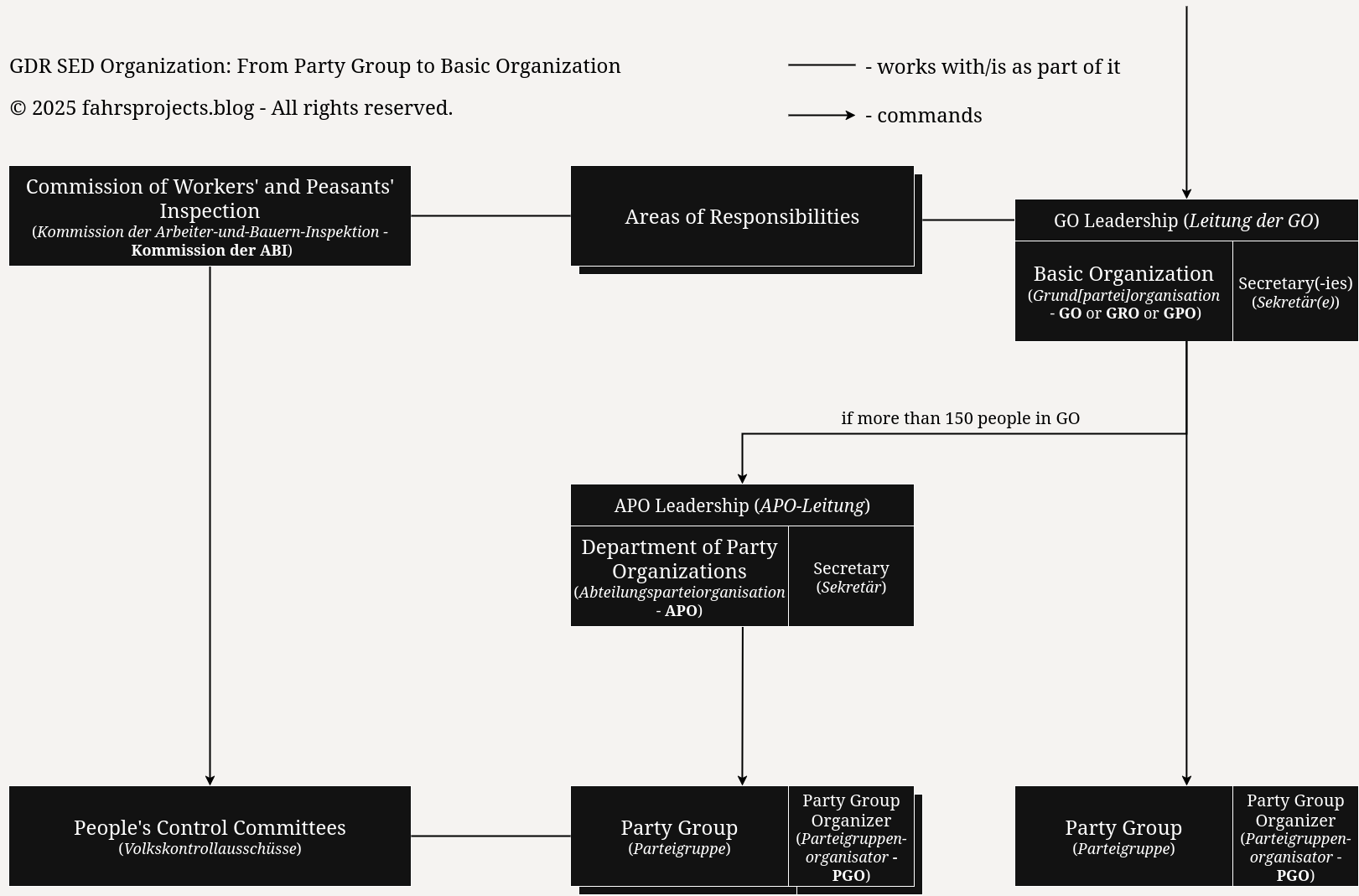 The central system and hierarchical structure of the SED were reflected at the district and county levels. The smallest unit of the SED was the Basic Organization (Grundorganisation – GO), which in turn was composed of Party Groups. The GO that was having more than 150 members was getting divided into the Departments of Party Organizations (Abteilungsparteiorganisationen – APO). If GO has fewer than 150 members, the Party Groups were directly subordinate to GO, without the APO in between.